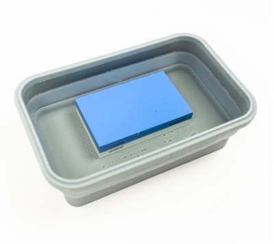 Submerge your whetstone in water for 10 to 15 minutes. Remove and shake off any excess water.